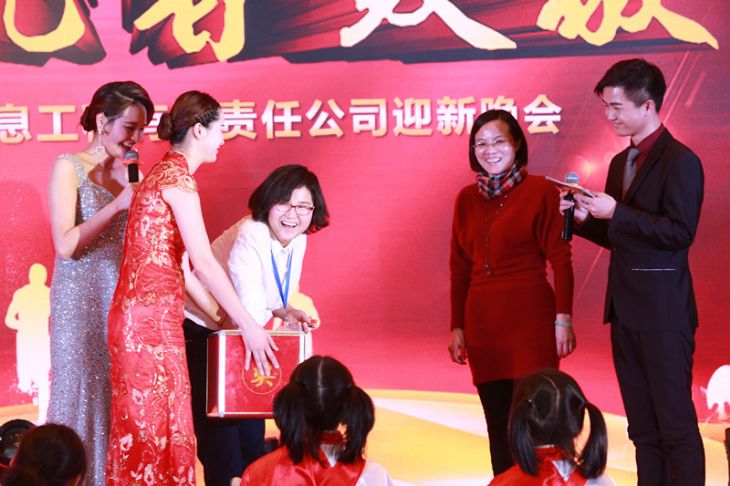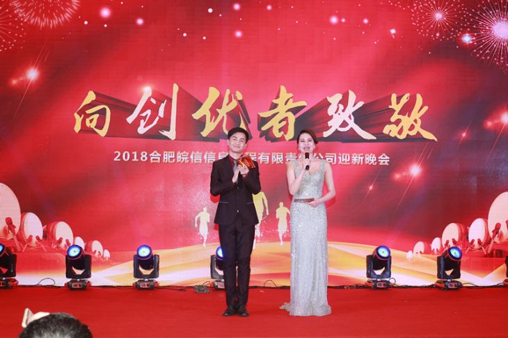 笑脸盈盈的女主持人在宣读新年愿景,2018年迎新晚会正式开始啦!