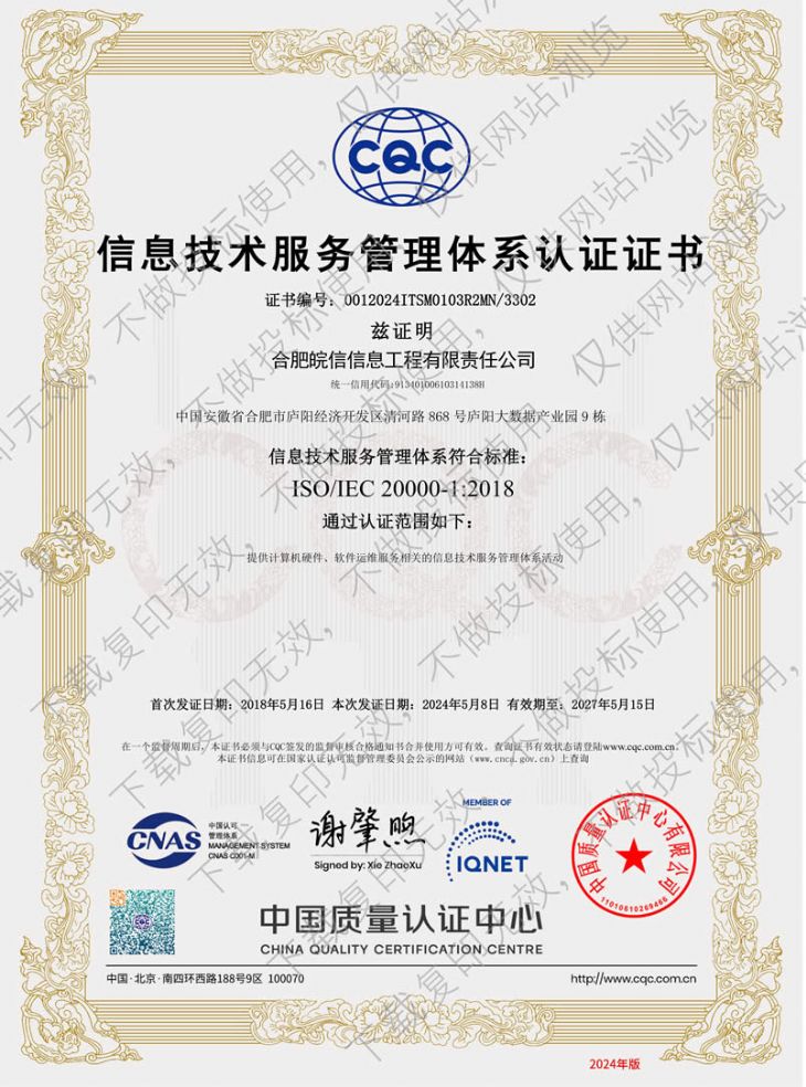 信息技术服务管理体系认证证书