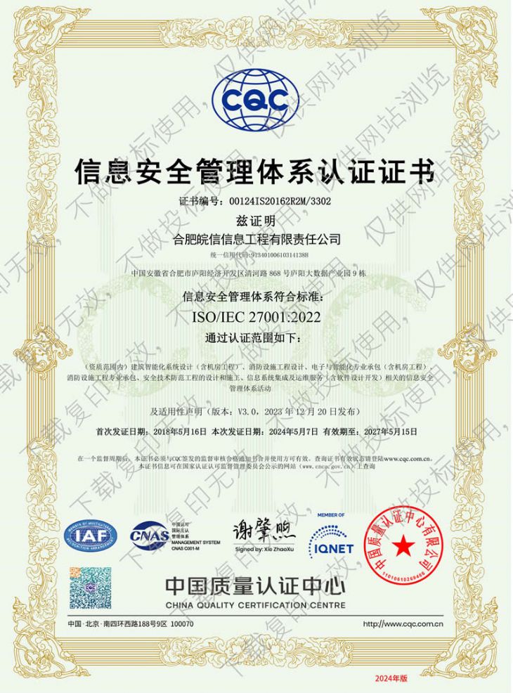 信息安全管理体系认证证书