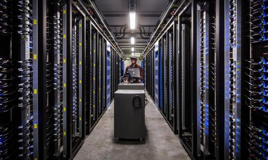 它看起来就像一个外表不规则的飞船。走进内部,又像极了《银翼杀手》中的场景:一条一条狭长的走廊发出嗡嗡声,忙碌中的服务器不停闪烁蓝光,巨大的风扇高速运转。这里利用当地便宜的水电来运转,借室外的冷空气降温,这里修筑的围墙不是为了拦截间谍,而是用来拦麋鹿的。