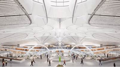 北京大兴国际机场首次采用“放射”状五指廊构型,是全球首个“双进双出”的航站楼。整个航站楼虽有82个登机口,但旅客安检后从航站楼中心到达最远端登机口步行不超过