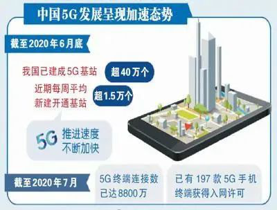 从全国范围来看,中国5G发展进入了全面加速阶段,基站建设进度超过预期。工信部最新统计显示,截至6月底,我国5G基站累计超40万个,近期平均每周新开通的5G基站超过1.5万个;截至7月底,5G终端连接数已达8800万。
