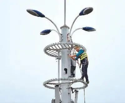 中国铁塔股份有限公司工作人员在长沙市天心区披塘路5G基站上加挂5G天线。