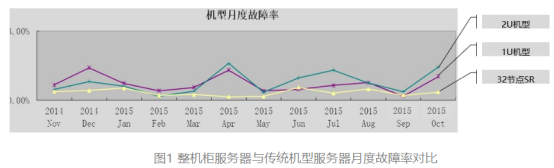 二是资源池化带来部件数量降低,故障率大幅下降。整机柜服务器通过将供电、制冷等部件资源池化,大幅减少了部件数量,带来故障率的大幅降低。图1比较了32节点整机柜服务器与传统1U、2U服务器机型各自的电源部件数量及在一年内的月度故障率情况。由于32节点整机柜服务器含10个电源部件,而32台1U通用服务器的电源部件为64个,相较而言,整机柜电源部件数减少84.4%。由于电源部件数量的降低,32节点整机柜服务器相对于32台1U通用服务器的月度故障率也大幅缩减。