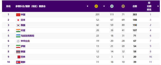 第19届亚运会于2023年9月23日至10月8日在中国杭州举行,本次亚运会中国体育代表团总人数达1329人,其中运动员886人(女运动员437人,男运动员449人),运动员平均年龄25岁。中国代表队此次亚运会共获得381枚奖牌,其中金牌201枚、银牌111枚、铜牌71枚,位居奖牌榜和金牌榜榜首。