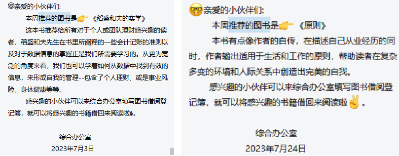道理大家都懂,但是想要养成阅读习惯,做到持续阅读可不是一件易事,因为人都是非理性的,很容易受外界因素的影响做出非理性决策。因此,一个正面、健康、积极向上的环境对于我们的成长至关重要。在一个追求卓越的组织中,员工才能够充分发挥自己的潜能,不断寻求创新和突破,这就是环境改变思维,思维改变行为,行为创造结果。皖信始终坚持“以人为本”,关注人才培养,努力为员工提供良好的发展环境与平台。为营造书香四溢、阅读蔚然成风的浓厚氛围,引导员工提升阅读兴趣、养成阅读习惯,近期,办公室推出了图书借阅服务,每周向大家推荐精品好书,鼓励大家在工作之余,以书为伴,丰富自己的文化生活。