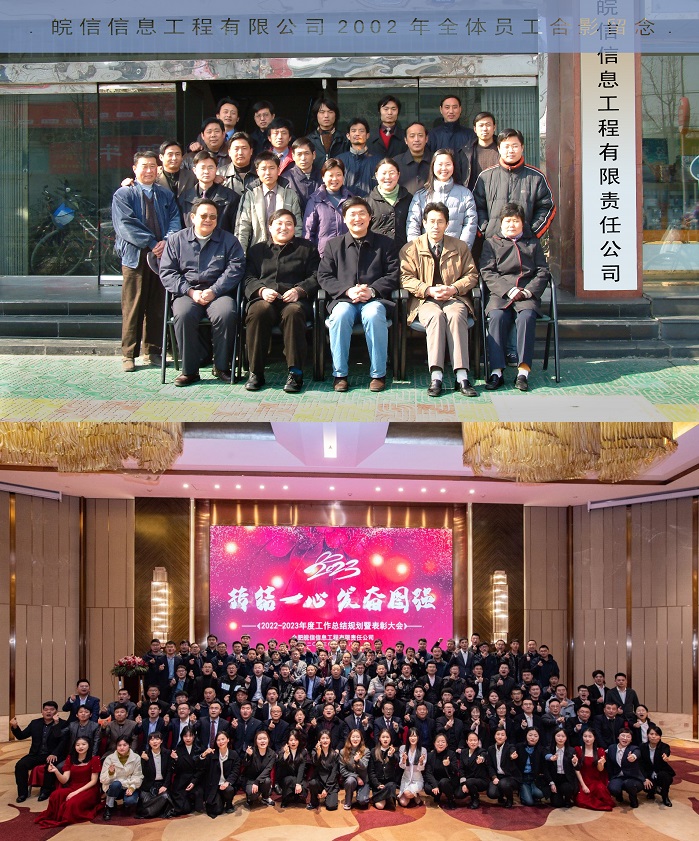 还记得2002年的春节前夕,皖信三位创始人杨总、朱总、张总携全体二十几名员工在公司门前温暖的合照。而今,我们已壮大成一支百余人的队伍,不变的是温暖依旧。