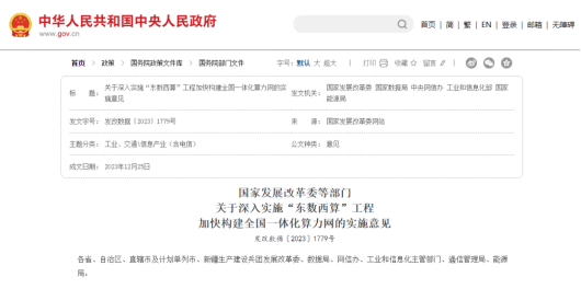 政策层面,国家对“东数西算”工程建设持续提供指引,推动算力网建设。2023年12月份,国家发展改革委、国家数据局等部门联合发布《关于深入实施“东数西算”工程 加快构建全国一体化算力网的实施意见》(以下简称《意见》),提出到2025年底,国家枢纽节点地区各类新增算力占全国新增算力的60%以上,国家枢纽节点算力资源使用率显著超过全国平均水平,1ms时延城市算力网、5ms时延区域算力网、20ms时延跨国家枢纽节点算力网在示范区域内初步实现,算力电力双向协同机制初步形成,国家枢纽节点新建数据中心绿电占比超过80%等目标。《意见》围绕“统筹通用算力、智能算力、超级算力的一体化布局”“统筹东中西部算力的一体化协同”“统筹算力与数据、算法的一体化应用”“统筹推动算力与绿色电力的一体化融合”“统筹算力发展与安全保障的一体化推进”提出了13项具体举措。