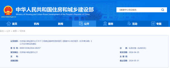近日,住建部就2项工程建设强制性国家规范《数据中心项目规范(征求意见稿)》公开征求意见,意见反馈截止时间为2024年5月31日。本次《征集意见稿》是2021年6月4日发布文件的升级版。(说明:强制性工程建设规范实施后,现行相关工程建设国家标准、行业标准中的强制性条文同时废止。)