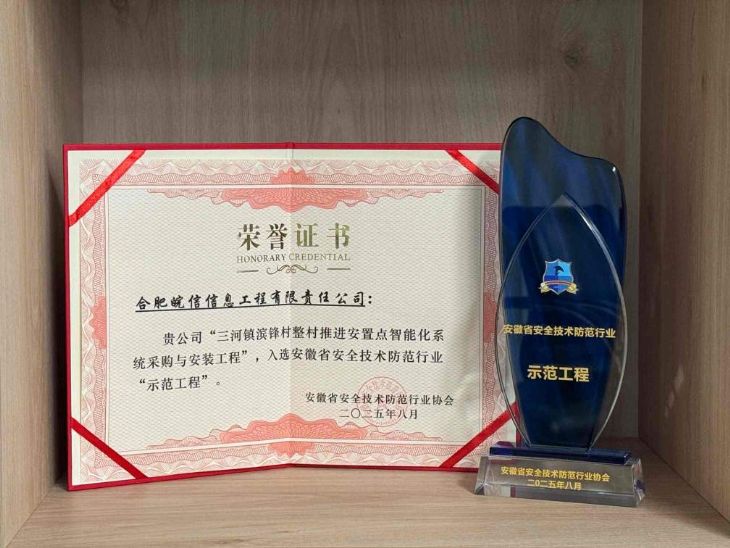 近日,从安徽省安全技术防范行业协会传来喜讯,我司香港图库全年资料大全负责的 “三河镇滨锋村整村推进安置点智能化系统采购与安装工程” 项目,凭借卓越的技术实力和出色的工程质量,成功入选安徽省安全技术防范行业 “示范工程”,并获颁荣誉奖杯与证书。