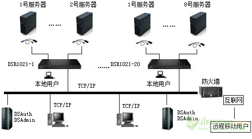 (2)连接在20台DSR上的上百台服务器,通过基于TCP/IP的DSView可从任何地点管理。
